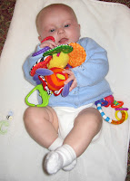 She has discovered some new vocal techniques that can shatter anything glass within a 5 mile radius. I will try to capture this on video so I can share it with you. She squeals so high pitched that my ears pop if she is in the snugli. She is totally impressed by her noises so she proceeds to 'sing' any chance she gets. Mom thinks she is making contact with critters from the fifth dimension. hahaha.